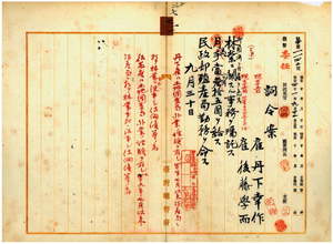 七一 台湾総督府民政部殖産局長宮尾舜治及ヒ同局長代理峡謙斉ノ職員任免具申ニ依リ台湾総督府雇ノ丹下幸作ト後藤学而ヲ御用済ニ付キ雇ヲ免シ、次デ林業ニ関スル事務ヲ嘱託シ増給ノ上台湾総督府民政部殖産局勤務ヲ命ス