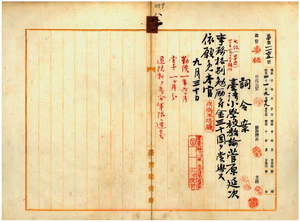 八一 台北第一尋常高等小学校勤務台湾小学校教諭菅原延次ハ脚気ニ罹リ職ニ堪ヘサル旨ヲ以テ退職ヲ願出タルニヨリ事務格別勉励ニ付キ一時金ヲ賞与シ本官ヲ免ス