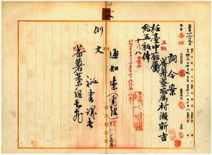 一八 台中庁長佐藤謙太郎ト蕃薯リョ庁長石橋亨ノ内申ニ依リ蕃薯リョ庁属村瀬新吉ヲ台中庁属ニ任ス
