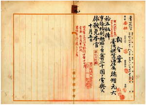 一九 斗六郵便局勤務台湾総督府通信属徳増元六ハ麻刺里亜ニ罹リ職ニ堪ヘサル旨ヲ以テ退官願ニ依リ昇級ノ上事務格別勉励ニ付キ一時金ヲ賞与シ本官ヲ免ス