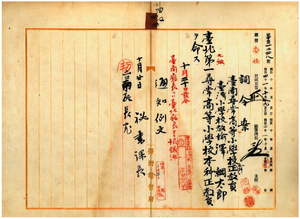 四四 台北庁長加藤尚志ノ内申ニ依リ台南尋常高等小学校本科正教員台湾小学校教諭沢綱太郎ニ台北第一尋常高等小学校本科正教員ヲ命ス