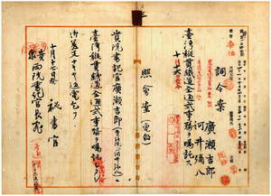 三 衆議院書記官広瀬吉郎並ニ貴族院書記官河井弥八ニ台湾縦貫鉄道全通式事務ヲ嘱託シ(一〇月一六日付)、手当一時金ヲ給ス