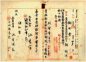 一二 蕃薯リョ庁長石橋亨ト台北庁長加藤尚志ノ内申ニ依リ台北庁技手兼台湾総督府技手調円次ヲ蕃薯リョ庁属兼蕃薯リョ庁技手ニ任ス