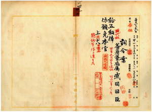 四二 蕃薯リョ庁属武田田臣ニ麻刺利亜ニ罹リ職ニ堪ヘサル旨ヲ以テ辞職願ニ依リ昇級ノ上本官ヲ免ス