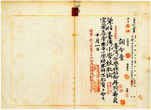 四四 宜蘭庁長中田直温ノ内申ニ依リ台東公学校勤務台湾公学校教諭丹羽寿貞ヲ台湾小学校教諭ニ兼任シ宜蘭尋常高等小学校本科正教員ヲ命ス