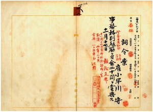 四八 台湾総督府民政部財務局長代理高山仰ノ内申ニ依リ御用済ニ付キ解雇サレタ警察本署勤務雇小早川守(一一月一七日付解職)ニ在職中事務格別勉励ニ付キ一時金ヲ賞与ス