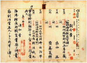 一三 澎湖庁長山田寅之助ノ上申ニ依リ臨時海港検疫官補澎湖庁警部ノ三上喜千蔵・衣山正・斎藤義輝、同澎湖庁警部補井出治平、臨時海港検疫所書記澎湖庁属斯波鉄馬ニ事務格別勉励ニ付キ一時金ヲ賞与ス