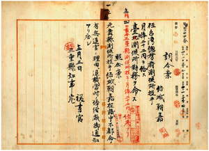 一五 台湾総督府民政部通信局長代理井村大吉ノ内申ニ依リ元三重県測候所技手結城朝嘉ヲ台湾総督府測候所技手ニ任シ台東測候所勤務ヲ命ス