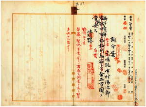 三二 台湾総督府民政部殖産局長代理福富喜之助ノ具申ニ依リ無手当ノ嘱託中村陽次郎ニ本島苧麻製紙事業企画ニ関シ勤務多大ナルニ付キ手当トシテ一時金ヲ給ス