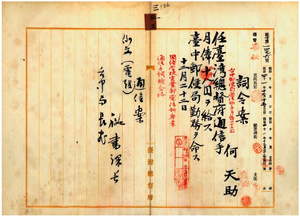 三三 台中郵便局長野村勘四郎ノ内申ニ依リ台中郵便局通信助手何天助ヲ台湾総督府通信手ニ任シ台中郵便局勤務ヲ命ス