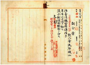 三九 淡水郵便局長鈴木金之介ノ内申ニ依リ淡水郵便局通信事務員大石磯二ヲ台湾総督府通信手ニ任シ淡水郵便局勤務ヲ命ス