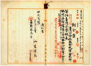 四八 澎湖庁長山田寅之助ノ内申ニ依リ台湾小学校教諭嘉義尋常高等小学校勤務大室金太郎ニ台湾小学校長ヲ兼任シ媽宮尋常高等小学校勤務ヲ命ス