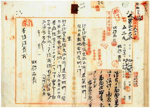五 基隆庁長曽祢吉弥ヨリ明治四一年五月二日付基庁総第一三一二号ノ一ヲ以テ稟申ノ什三份警察官吏派出所建築材料労力並敷地寄附受納ニ関シ財務局長ヨリ同庁長ヘ照会ノ件