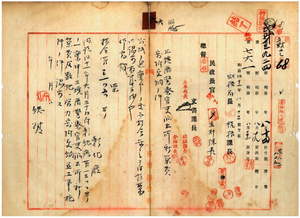 六 彰化庁馬芝堡三塊厝庄四民社管理人李聲洲ヨリ同社ノ建物敷地ト同堡同庄ノ李和尚・黄林渦及ヒ同堡四塊厝庄ノ陳啓徳・洪占嘴・謝鳳儀並ニ同堡南港庄ノ陳図ヨリ同地区ニ於テ陳啓徳外四五八名ヨリ徴集シタル寄附金一四〇〇円ト労力七〇人ヲ三塊厝警察官吏派出所新築費労力及敷地寄附ヲ出願シタルニ依リ受納方許可ニ付キ彰化庁長小松吉久ヨリノ稟申ニ対シ同派出所新築費及敷地・労力寄附受納並工事施行ヲ認可スルノ件(指令第三一〇六号)