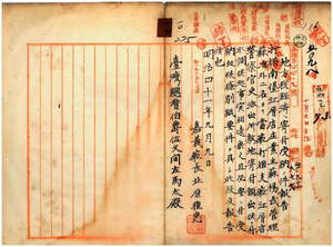 一〇 嘉義庁大目根堡竹頭崎庄業主蘇楊武管理蘇海鵞・打猫南堡江厝店庄蘇准業主福徳爺管理劉老色ヨリ出願ノ打猫南堡江厝店庄ノ江厝店警察官吏派出所敷地寄付受納ノ旨嘉義庁長北原種忠ヨリ報告ノ件