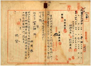 三 桃園庁竹北二堡楊梅箇庄市街道路開鑿ノ為メ同堡同庄ノ楊梅箇庄人民総代ノ黄雲挙ヨリ願出サレタ労力二二六〇人及ヒ李洋杰・李金益・李水益ヨリ所有シタル原野及ヒ畑並ニ建物敷地ノ寄附願受納ニ関シ桃園庁長西美波ヨリ稟申方認可ノ件(指令第一六八四号)