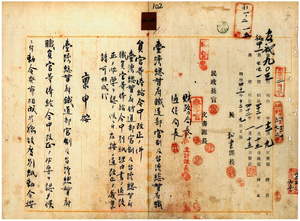 二 台湾総督府鉄道部長長谷川謹介ノ稟申ニ依ル台湾縦貫鉄道竣功ニ伴フ台湾総督府鉄道部官制及総督府職員官等俸給令中改正勅令按内務大臣ヘ稟申ノ件台湾四 第二四号 台北庁直轄ノ陳丁・洪溯喬・玩添喜・蘇氏我・林古井・李氏秀・唐番・陳烏猫・徐慶福・張暗・王名・蔡陳・連胡・高林氏罔・林加寅・許国治・唐万居・謝二・林冬瓜・聶亮賢・林土・林万生・林文珍・曽紅・周宗木・周和栄・劉西・林撥来・周清富・王氏本雪・士林支庁管内ノ黄阿番・張和尚・楊鐘・陳天来・鄒助・闕徳品・呉倒・許永活・王仏・簡添・余益・詹淮洋・徐二・陳珍・枋橋支庁管内ノ貴鳳・李石水・簡呆・黄興九・林細・頼惷・劉最・黄紫印・張金枝・許珍・滬尾支庁管内ノ沈木・陳辛平・林添丁・李永成・呉錮・謝紅・江金発・黄氏四 第二四号 台北庁直轄ノ陳丁・洪溯喬・玩添喜・蘇氏我・林古井・李氏秀・唐番・陳烏猫・徐慶福・張暗・王名・蔡陳・連胡・高林氏罔・林加寅・許国治・唐万居・謝二・林冬瓜・聶亮賢・林土・林万生・林文珍・曽紅・周宗木・周和栄・劉西・林撥来・周清富・王氏本雪・士林支庁管内ノ黄阿番・張和尚・楊鐘・陳天来・鄒助・闕徳品・呉倒・許永活・王仏・簡添・余益・詹淮洋・徐二・陳珍・枋橋支庁管内ノ貴鳳・李石水・簡呆・黄興九・林細・頼惷・劉最・黄紫印・張金枝・許珍・滬尾支庁管内ノ沈木・陳辛平・林添丁・李永成・呉錮・謝紅・江金発・黄氏総督府官制中改正・台湾総督府鉄道部官制中改正・台湾総督府地方官官制中改正・台湾総督府職員官等俸給令改正・台湾総督府視学官特別任用令制定公布ニ付キ通知電報ノ件[四も見よ](1908/11/24~1909/05/04);台湾総督府官制中改正・台湾総督府鉄道部官制中改正・台湾総督府地方官官制中改正・台湾総督府職員官等俸給令改正・台湾総督府視学官特別任用令制定公布ニ付キ通知電報ノ件[四も見よ](1908/11/24~)