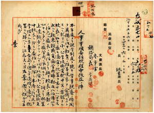 八 台湾総督府民政部総務局長山田新一郎ノ照会ニ依リ本年度ヨリ視学制度ヲ施キ学事視察ノ機関ヲ具備シ以テ小学校・公学校ノ進歩改善ヲ回リ内容充実ヲ期セントシ小学校・公学校職員中校長ニ対スル委任ヲ解除シ学校職員ノ異動ハ全テ本府ニ於テ掌理スルコトトナス為メ明治三八年三月訓令第四〇号人事事項委任規程中改正ノ件(訓令第九六号)