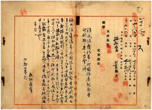 一一 明治四〇年一〇月府令第八六号外国旅券規則中改正ノ件(府令第九七号)並ニ移民保護法並外国旅券規則等ノ印刷物送付ニ関シ内務大臣官房台湾課長川村竹治ヨリ台湾総督府民政長官代理総務局長山田新一郎ヘ明治四〇年四月二〇日統監府令第一六号外国旅券規則取扱手続改正及ヒ明治四〇年五月四日外務省令第三号ヲ以テ四〇年三月外務省令第一号外国旅券規則第一〇条但書ヲ削除シ同第一九条ヲ改正ノ旨申添ノ件