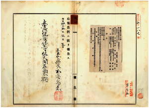 六一 第一三号 台北庁芝蘭三堡滬尾街蔡百箴ト興直堡新庄街黄慶霖ノ収入印紙売捌所移転ヲ許可ス (1909/03/03~);台北庁・深坑庁・桃園庁・新竹庁・苗栗庁・台中庁・南投庁・斗六庁・塩水港庁・台南庁・鳳山庁ノ告示供閲ノ件 (1909/03/06~1909/03/29)
