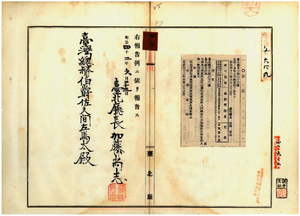四三 第六三号 台北庁大加蚋堡大稲花稲新街星加彦太郎ニ収入印紙売捌許可ノ件 (1909/06/23 ~1909/08/30);台北庁・基隆庁・桃園庁・新竹庁・彰化庁・南投庁・斗六庁・塩水港庁・台南庁・蕃薯リョ庁・恒春庁ノ告示供閲ノ件 (1909/06/28 ~1909/08/30)