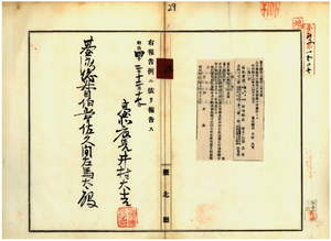 九 第一三五号 台北庁三貂堡澳底庄林見田ノ支那形船鑑札流失ニ付キ該鑑札無効ノ旨通報ノ件