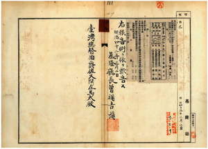 四七 第九号 台南庁管内ノ効忠里王城西社林鶏屎ノ竹筏・台南市海安宮街董助ノ手梯・効忠里安平街黄天扶ノ龍艚ノ船鑑札流失ニ付キ該鑑札無効ノ旨台南庁ヨリ通知ノ件