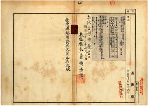 五七 第一九号 台南庁管内ノ台南市北勢街呉荘ノ手梯船鑑札遺失・効忠里安平街顔定国ノ支那形金徳利船鑑札流失ニ付キ該鑑札無効ノ旨台南庁ヨリ通知ノ件