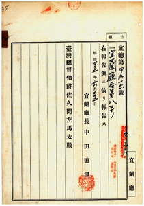 八 第八号 明治四二年三月宜蘭庁令第二号宜蘭米同業組合規則中改正ノ件 (1909-06-23 ~1909-07-08);宜蘭庁令第二号ニ付キ照会・回答及ヒ訂正ノ旨通牒ノ件 (1909-03-26 ~1909-04-23);宜蘭庁ノ庁令供閲ノ件 (1909-07-01 ~1909-07-08)