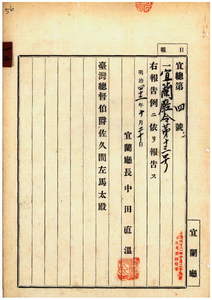 一三 第一三号 明治三六年四月宜蘭庁令第九号街庄長管轄区域中浮洲区及叭哩沙区ヘノ庄追加ノ件 (1909-10-20 ~1909-12-14);宜蘭庁・桃園庁・斗六庁・塩水港庁ノ庁令供閲ノ件 (1909-11-19 ~1909-12-14)