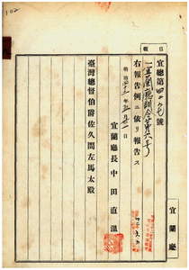 一九 第六号 害虫駆除予防巡視員ニ月額旅費支給ノ件 (1909-05-31 ~1909-07-29);宜蘭庁・彰化庁・斗六庁・嘉義庁・台南庁・鳳山庁・恒春庁ノ訓令供閲ノ件 (1909-06-11 ~1909-07-29)