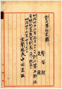 二五 第一二号 明治四二年五月宜蘭庁訓令第五号隘勇線配置定員改正ノ件 (1909-10-20 ~1909-11-12);宜蘭庁ノ訓令供閲ノ件 (1909-10-29 ~1909-11-12)