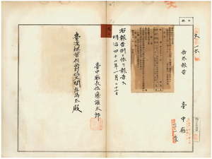 九〇 第七号 台湾阿片令施行規則ニ依リ台中庁大肚中堡鴨母リョ庄王喊ニ阿片煙膏請売営業ヲ特許ス