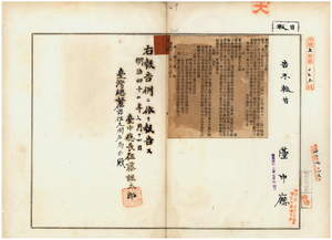 三四 第七九号 台中庁管下一円ノ稲苗代田ニ稲螟虫(一点螟虫二化虫)発生セシヲ以テ明治四一年九月律令第一四号台湾害虫駆除予防規則第三条ニ拠リ明治四二年七月一五日ヨリ八月一四日迄駆除予防施行ノ件