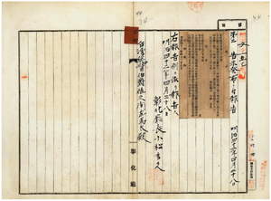 三四 第三四号 斗六庁大怒榔東頂堡新街庄ヲ牛疫流行地ト認メ牛羊属ノ出入及病毒伝播ノ虞アル物品ノ搬出停止中ノ処其処置ヲ解除シタル旨同庁ヨリ通知ノ件