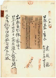 一三四 第二七号 斗六庁大怒榔東頂堡新街庄ヲ牛疫流行地ト認メ牛羊属ノ出入及病毒伝播ノ虞アル物品搬出ヲ停止シタル旨同庁ヨリ通知ノ件