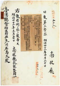 一三八 第三一号 斗六庁管内ニ牛疫発生ニ付キ同庁ヨリ通知ノ件(1909-05-01~1909-05-22);南投庁・斗六庁・嘉義庁・塩水港庁・台南庁・蕃薯リョ庁・鳳山庁・阿緱庁・恒春庁・台東庁・澎湖庁ノ告示供閲ノ件(1909-05-07 ~1909-05-22)