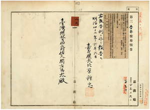 八九 第四二号 台南庁管内ヲ牛疫流行地ト認メ牛羊豚ノ出入並ニ病毒伝播ノ虞アル物品ノ搬出ヲ停止シタル旨同庁ヨリ通知ノ件