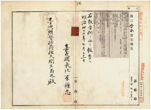 一〇四 第五七号 嘉義庁打猫東下堡ノ陳厝リョ庄・大姓美庄・中林庄ヲ牛疫流行地ト認メ牛羊豚ノ出入及病毒伝播ノ虞アル物品ノ搬出入ヲ停止中ノ処該疫終熄ニ付キ其処置ヲ解除ス