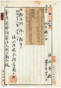 鹽水港廳廳令第四號四十一年府令第七十六號荷車取締規則施行