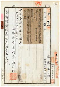 一〇一 第七四号 台南庁管内ヲ牛疫流行地ト認メ牛羊豚ノ出入並ニ病毒伝播ノ虞アル物品ノ搬出入ヲ停止中ノ処該処置ヲ解除シタル旨同庁ヨリ通知ノ件