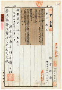 一〇六 第七九号 嘉義庁管内ヲ牛疫流行地ト認メ牛羊豚ノ出入及病毒伝播ノ虞アル物品ノ搬出入ヲ停止中ノ処其処置ヲ解除シタル旨同庁ヨリ通知ノ件