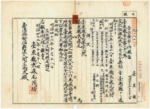 二八 第二八号 台南庁管内ノ効忠里安平街大阪商船株式会社安平支店所有ノ日本形団平船二艘ト台南市庚陳及所有ノ支那形手梯ノ船鑑札流失ニ付キ該鑑札ヲ無効トス