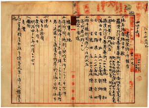 三一 蕃薯リョ庁長石橋亨ヨリ羅漢外門里蕃薯リョ街陳順和・港西上里中牙庄劉炳華・港西上里瀰濃宋守四・港西上里龍肚庄陳連生カラ羅漢外門里蕃薯リョ街ノ畑ヲ陸軍用地トシテ寄附受納(明治四二年六月二六日)ニ付キ報告ノ件