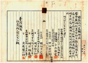 一二 台北庁ヨリ台北庁大加蚋堡台北崔崢新起横街真言宗台北布教所駐在真言宗連合台湾開教師小山祐全・同布教所信徒惣代ノ台北大稲花北門外街中村啓次郎・台北崔崢西門外街服部甲子造・台北城内府中街岡田敬五郎・台北城内書院街嶋浦福蔵・台北崔崢新起街大歳徳太郎ヨリ真言宗台北布教所ヲ京都市教王護国寺ヨリ和歌山県高野山金剛峰寺ニ所属転換届出ノ件