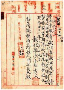 一五 彰化庁長小松吉久ヨリ彰化庁線東堡彰化街岡本泰道ヨリ出願ノ本派本願寺彰化布教所ヲ同地ニ建立許可報告ノ件