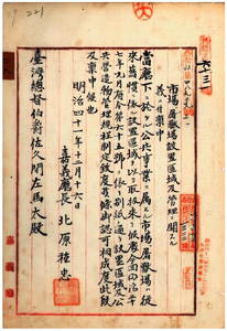 二八 嘉義庁長北原種忠ヨリ稟申ノ公共事業ニ属スル市場屠獣場設置区域及ヒ公共営造物管理規程認可ノ件(指令第一二二〇号)