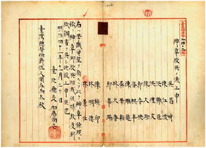 三〇 台北庁長加藤尚志ノ上申ニ依リ台北庁大加蚋堡崔崢頂新街呉昌才・同堡大稲花普願街陳江流・同堡大稲花千秋街洪輔臣・同堡大稲花千秋街洪礼文・同堡大稲花建昌街陳大珍・同堡大稲花太平横街郭春秧・同堡大稲花建昌街容祺年・同堡大稲花中街陳雕龍・芝蘭二堡和尚洲渓茄庄蔡学韜・同堡嗄円別庄林大春・芝蘭一堡新里族庄郭華瑞・興直堡頭前庄陳鎮印・同堡新庄林明徳ヘ台湾紳章条規ニ依リ紳章附与ノ件