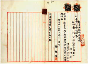 一九 新竹庁管内樹砥林公学校勤務台湾公学校訓導徐礼発ノ台湾公学校訓導無試験検定出願ニ付キ教員免許状授与ノ件