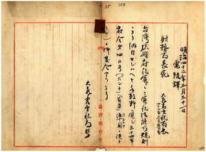 二五 関税法施行規則ニ依リ納付セシムへキ輸入貨物ノ手数料ニ関シ明治三四年府令第四〇号準用ニ付キ淡水ト安平税関長ヘ通牒ノ件